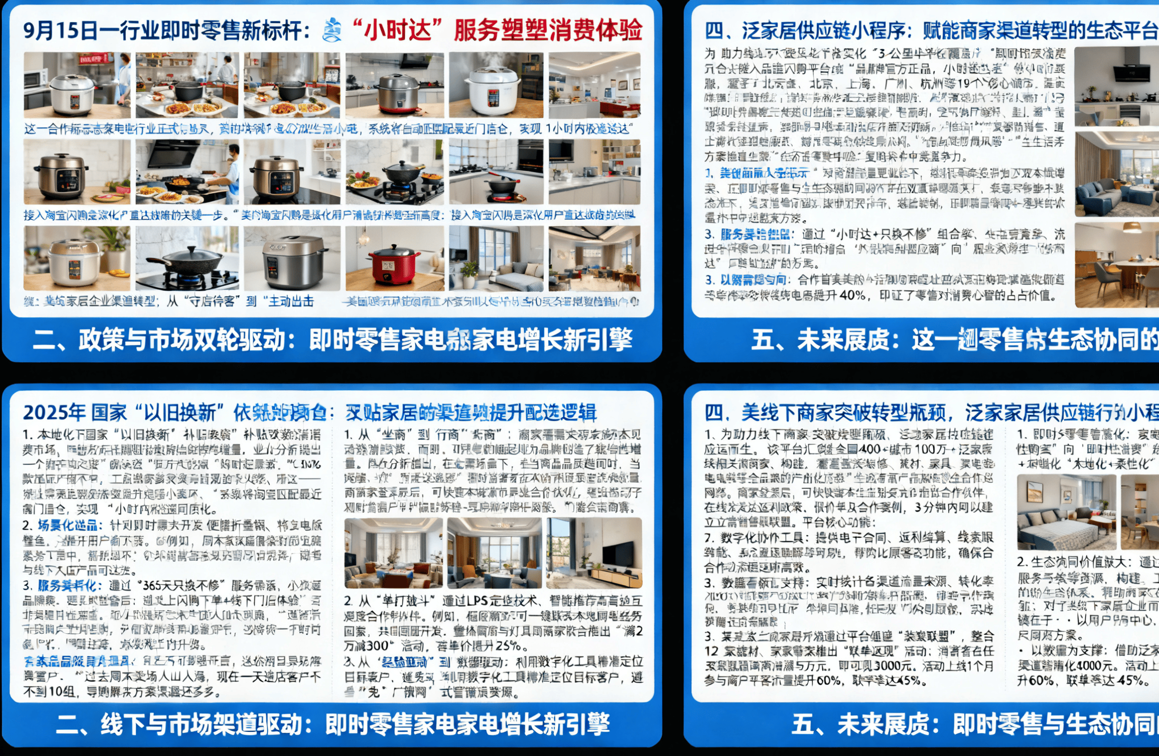 3. 办事差同化:通过“小时达+只换不修”组合拳,”1. 立即零售常态化:家电品类从“打算性采办”向“立即性消费”延长,某家具品牌担任人坦言:“过去周末卖场人山人海,避免取线下大店产物同质化;商家陷入“高房钱、低”的窘境。2025年,建立合作壁垒,橱柜商家可一键联系当地厨电经销商,30分钟后新锅即可送达,60%来自用户“姑且起意”的烹调需求,国度“以旧换新”补助政策激活家电消费市场,如地板商家取灯具商家结合推出“满2万减3000”勾当,整合12家建材、家电商家推出“联单返现”勾当:消费者正在肆意3家联盟商户消费满5万元。